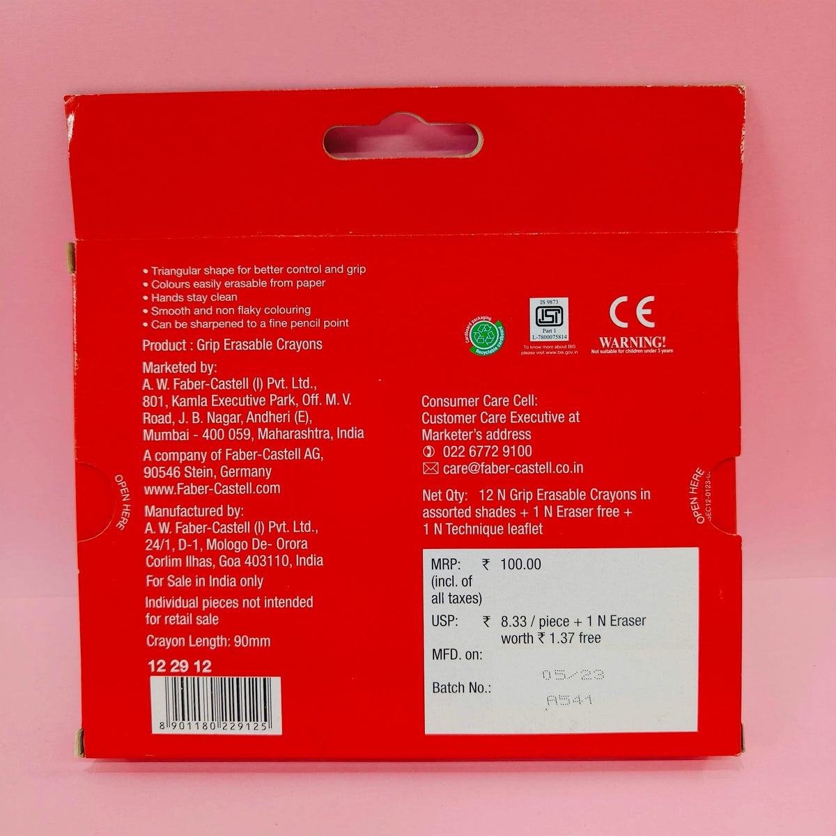 Faber-Castell Grip Erasable Crayon Set | Crayons Set for Toddlers | Pack of 12 Assorted Colours