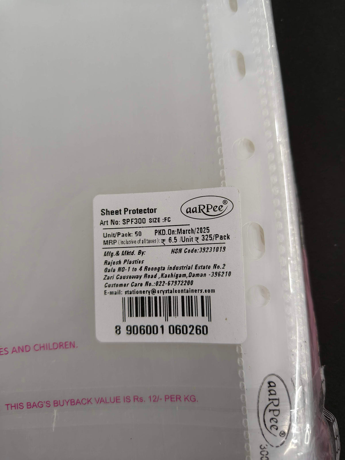 aaRPee Sheet Protector | Multipurpose File Folder | Legal / A4 Size | 300 Micron Thickness | Transparent Document Sleeves with 11 Punch Holes | Pack of 50 Pieces